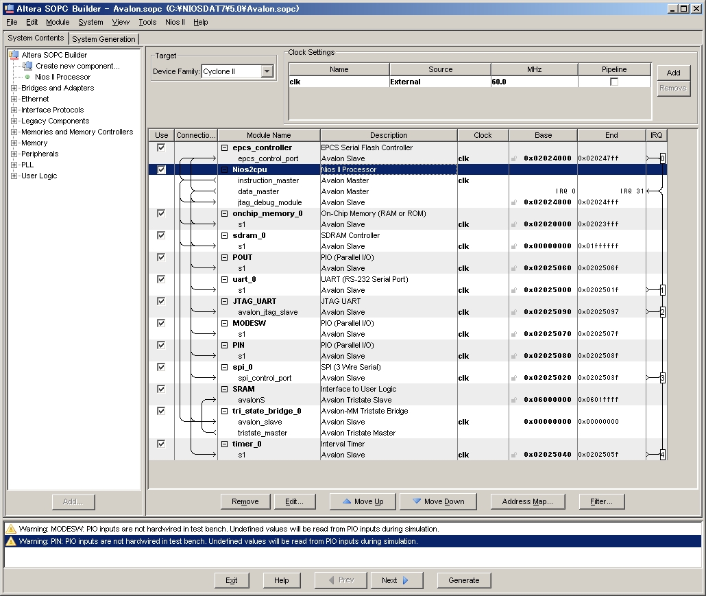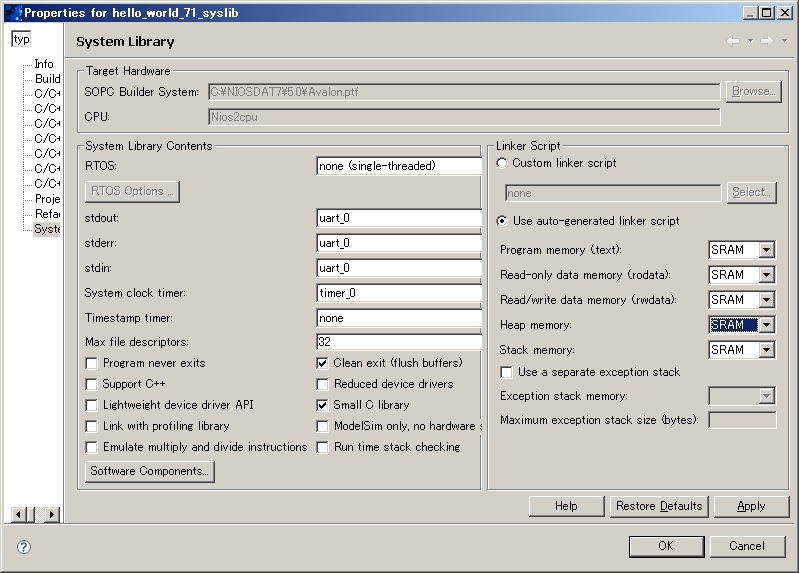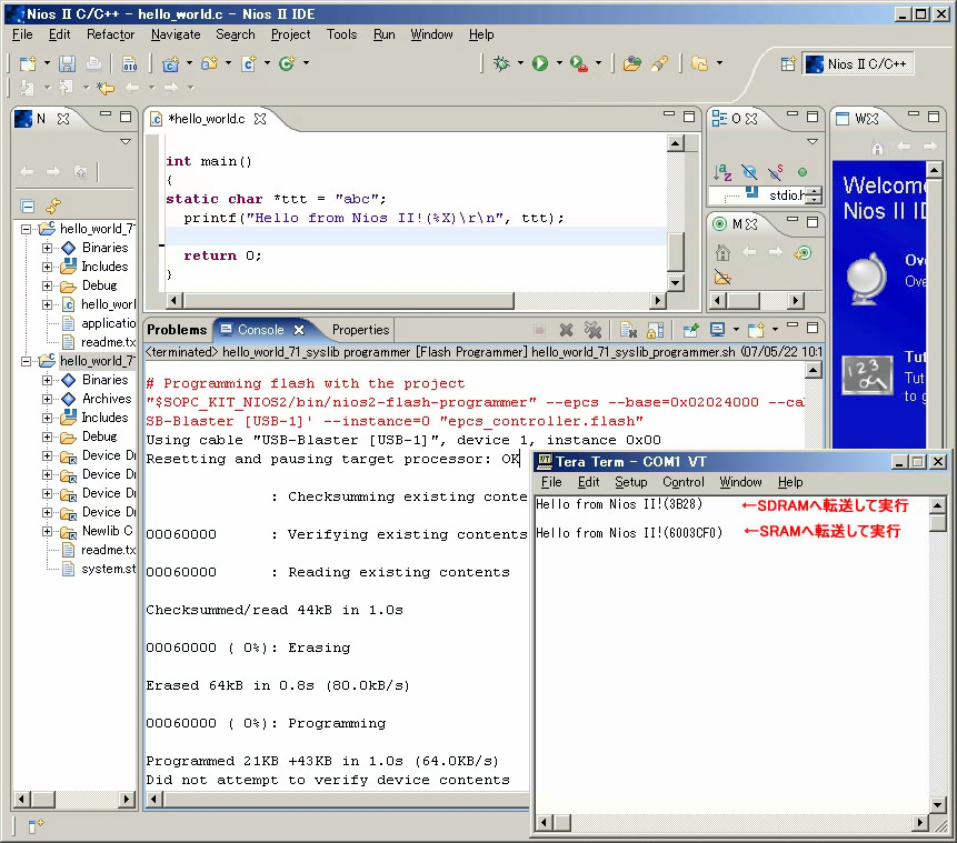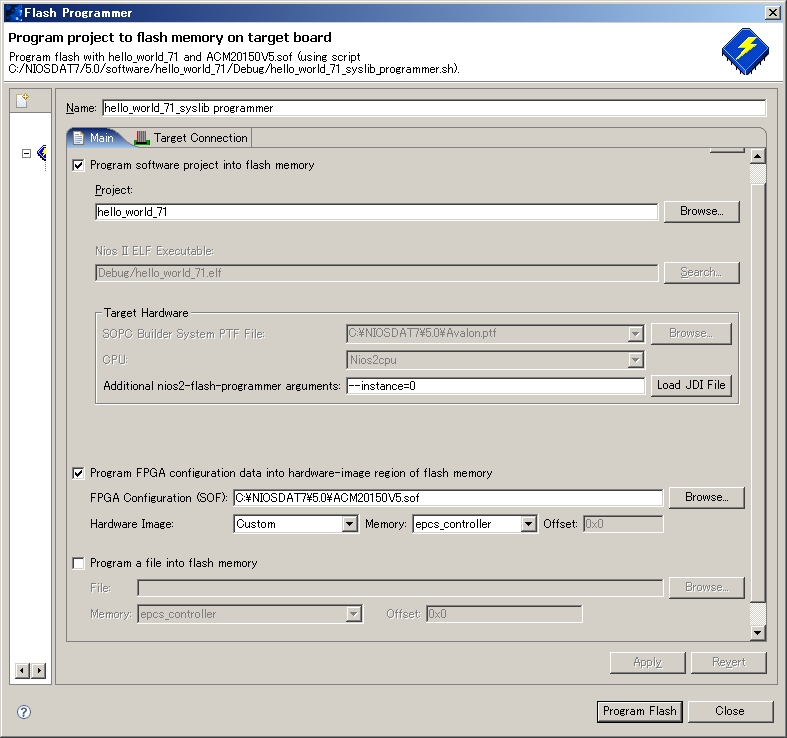 ACM-201シリーズ NiosII 設定例(Ver7.1) EPCS16にコンフィグレーションデータとプログラムを書き込み、SRAMへプログラムを展開して実行する例 |